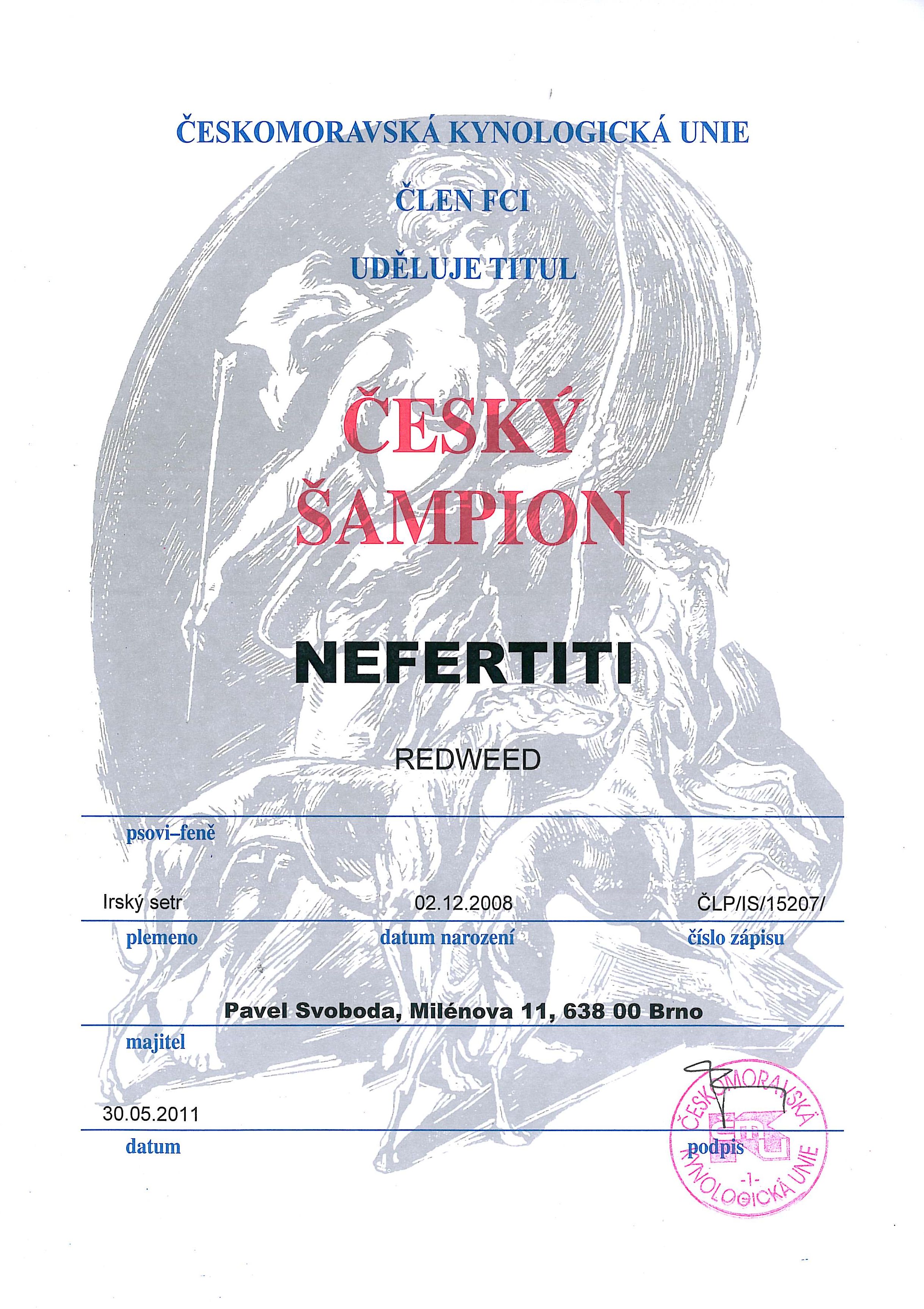 V sobotu jsme se po delší době předvedli i na výstavním poli. Po úžasném výsledku na Poháru vzpomínek se dostavil další super výsledek z národní výstavy. Poprvé jsme nastoupili ve třídě šampionů, kdy nám byla protivníkem Neiven Arouse Admiration p. Hulíkové. Po velmi přísném posouzování M. Václavíka, kdy nikdo předem netušil jak dopadne, protože se udělovali velmi nízké známky, jsme získali svůj první titul ve třídě šampionů. Následně přišlo klání o Národního vítěze, kde jsme uspěli a poté se běželo o BOBa, kde po dlouhém váhání pana rozhodčího utvrdilo, že to máme být my. Radost z výsledku byla neskutečná a Amy si to asi podle svého výrazu uvědomovala. Do závěrečných soutěží jsme nastupovali s nevelkými ambicemi, protože jsme se tak daleko nikdy nedostali. Závěrečnou soutěž posuzoval slovinský rozhodčí, kterému jsme se líbili a vybral nás do užšího výběru, kde zůstalo 5 psů. Konečný verdikt zněl 3 místo = BIG 3!. Vlna euforie a radosti byla obrovská a i ta slza se dostavila. Byl to báječný zážitek a Amy udělala krásný dojem v našich srdcích.