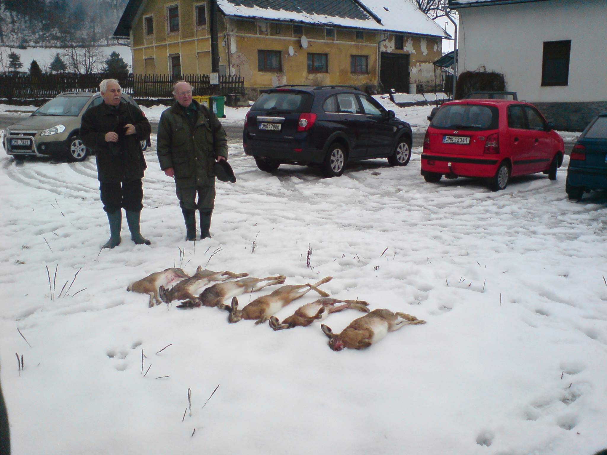 Náš poslední hon v roce 2011 se konal v naší domovině. Po dlouhých letech se opět uskutečnil hon na zajíce v MS Malá Morava, kde tak nějak působíme společně s naším dědou. Během pěti lečí bylo uloveno 6 zajíců což byl moc hezký výsledek. Následně proběhla poslední leč, kde jsme patřičně zapili úlovky a ukončili rok 2011.